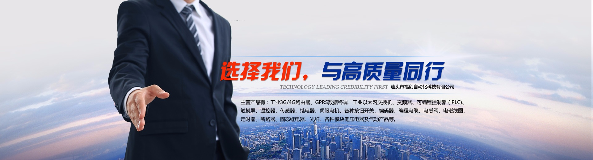 汕頭市福創(chuàng)自動化科技有限公司是一家集自動化元件的代理銷售與維修、自動化設(shè)備設(shè)計制造、自動化工程安裝改造、機(jī)電工程安裝改造、自動化機(jī)械設(shè)備設(shè)計與制造的企業(yè)。  主營產(chǎn)品有:工業(yè)3G/4G路由器、GPRS數(shù)據(jù)終端、工業(yè)以太網(wǎng)交換機(jī)、變頻器、可編程控制器(PLC)、觸摸屏、溫控器、傳感器、繼電器、伺服電機(jī)、各種按鈕開關(guān)、編碼器、編程電纜、電磁閥、電磁線圈、定時器、斷路器、固態(tài)繼電器、光纖、各種模塊低壓電器及氣動產(chǎn)品等。
